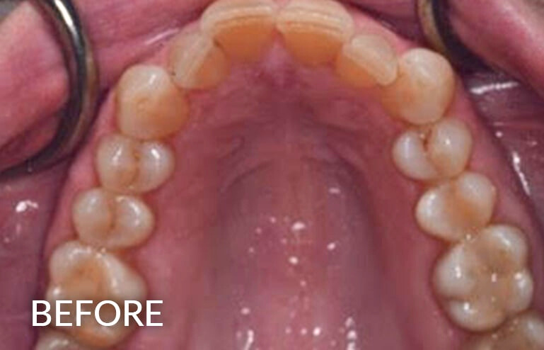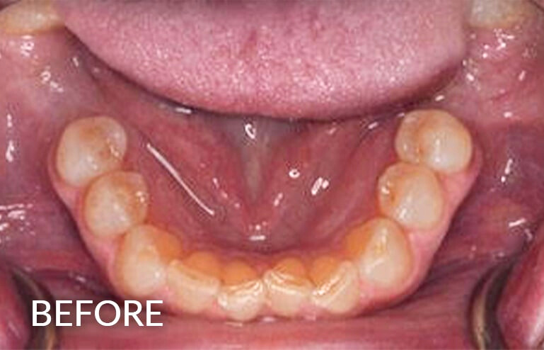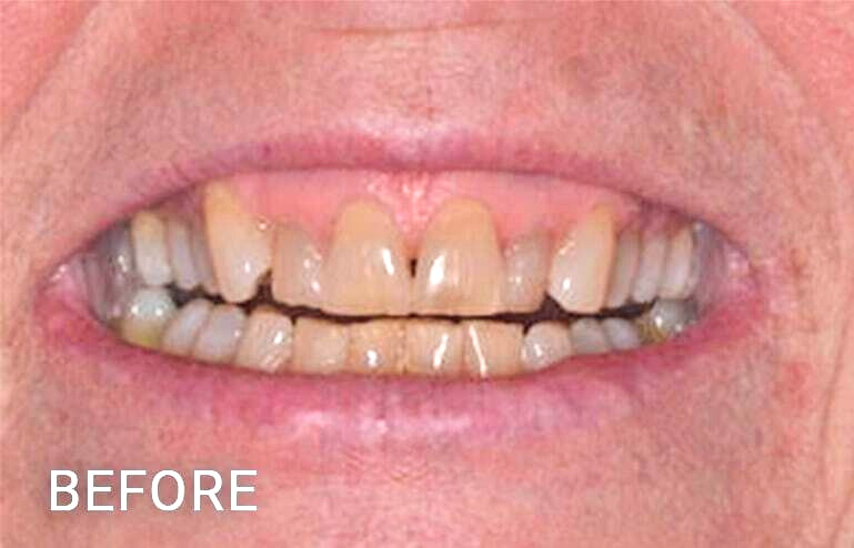 This was an example of worn-down, crooked upper and lower teeth. In phase 1 of the treatment, orthodontics were used to straighten and level the teeth. During phase 2, crowns and veneers were applied to create a natural smile and a proper bite.