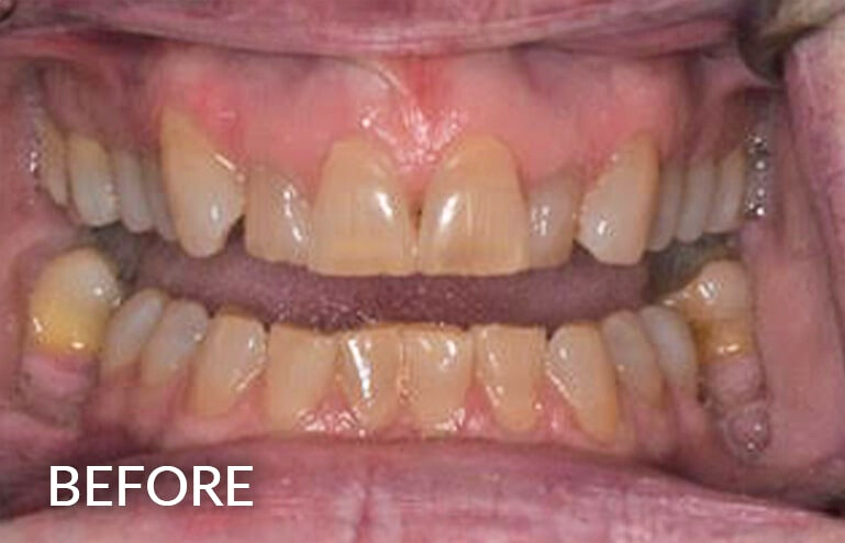 This was an example of worn-down, upper and lower crooked teeth. In phase 1 of the treatment, orthodontics were used to straighten and level the teeth. During phase 2, crowns, veneers, and implant crowns were placed to create a natural smile and a proper bite.